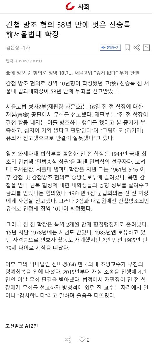 뉴스 & 인사이트 최근소식 업무사례 최근소식 에스앤엘 파트너스, 재심으로 고(故) 진승록 전 서울대 법과대학장의 간첩방조 무죄판결을 이끌어내다 05.24, 2019 http://m.chosun.com/svc/article.html?contid=2019051700214#Redyho 목록 이전 다음