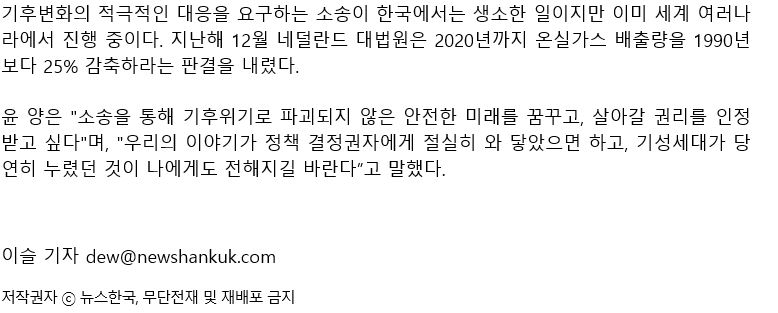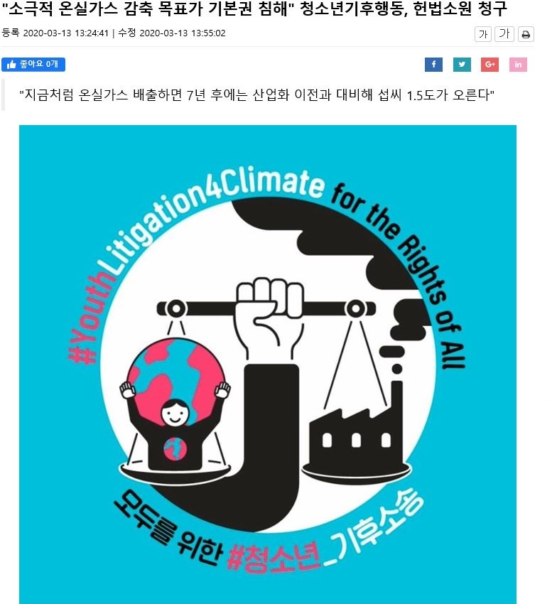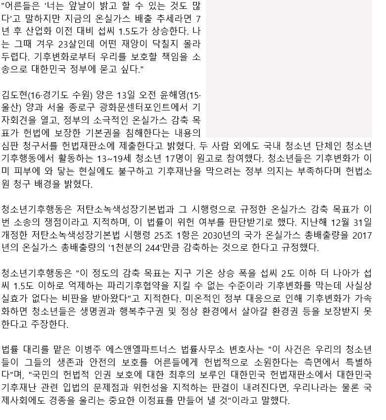 뉴스 & 인사이트 최근소식 업무사례 최근소식 [에스앤엘 소송대리] '소극적 온실가스 감축 목표가 기본권 침해' 청소년기후행동, 헌법소원 청구(뉴스한국) 03.16, 2020 [출처 : 뉴스한국]https://www.newshankuk.com/news/content.asp?news_idx=202003131325000103 목록 이전 다음